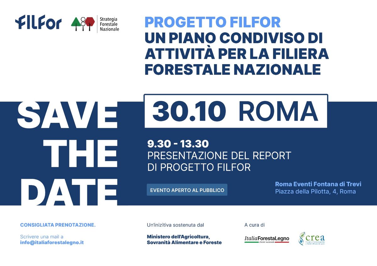 Il 30 ottobre 2025, presso Roma Eventi Fontana di Trevi, Via della Pilotta 4 a Roma, si terrà l'evento conclusivo per la presentazione del report finale del progetto FilFor - Filiere Forestali Nazionale.